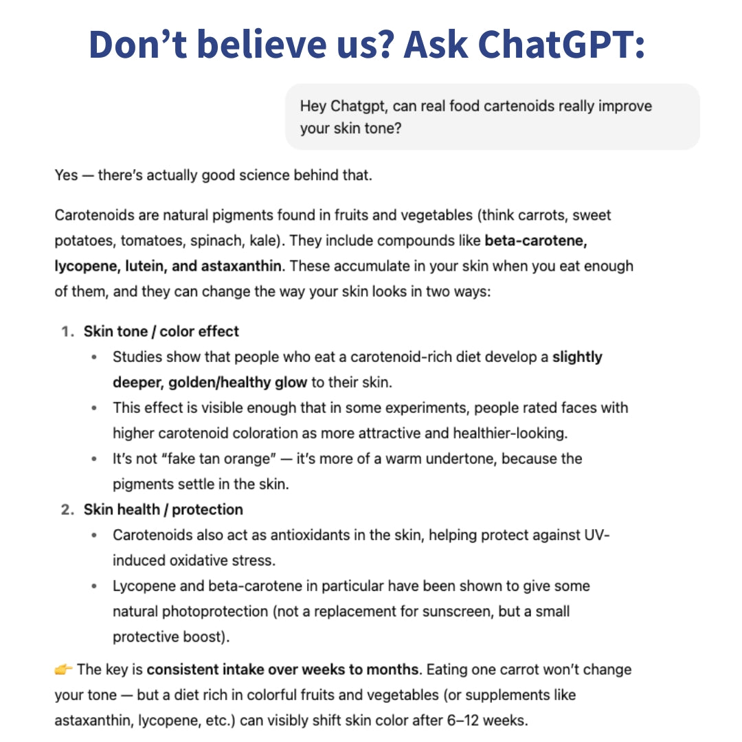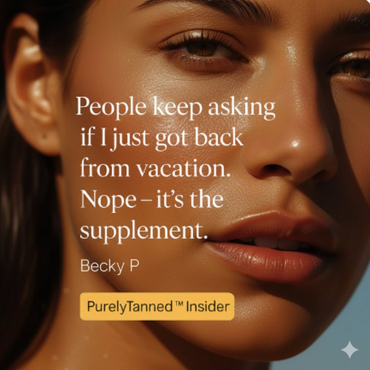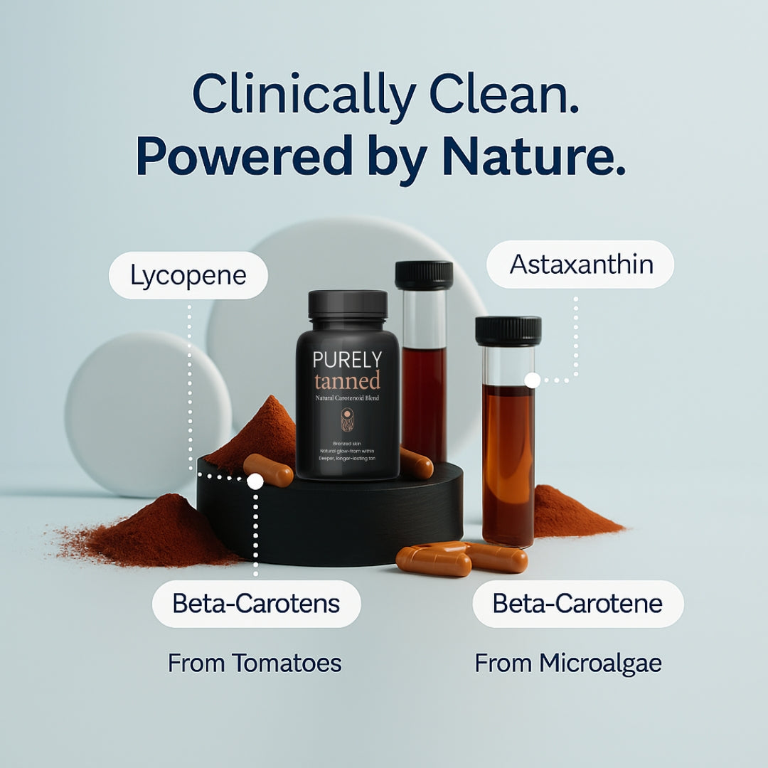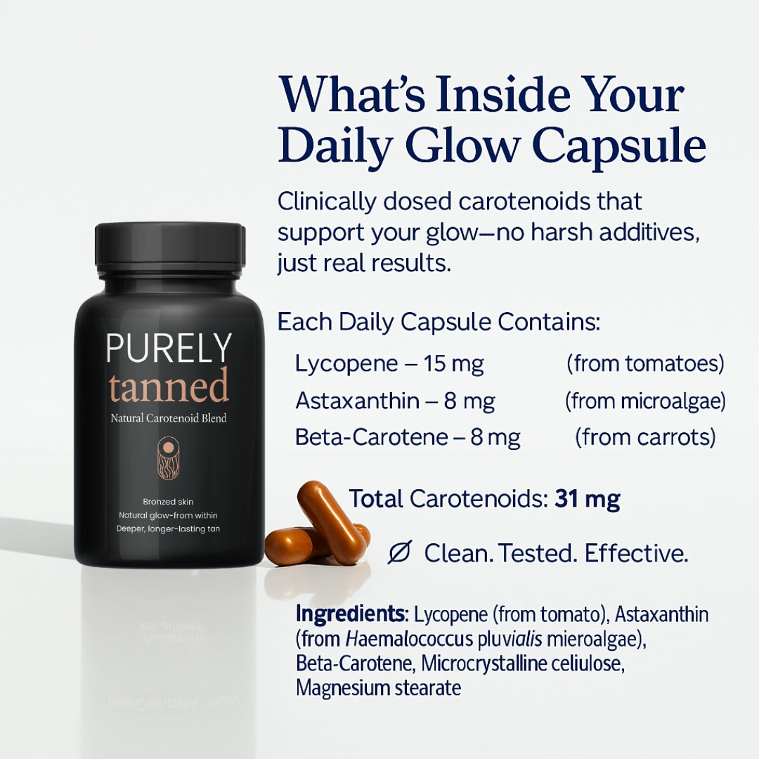 PurelyTanned™ uses a science-backed blend of natural carotenoids and vitamins to enhance your skin tone from within. These pigments build up in your skin, creating a warm, bronzed glow—without streaks, stains, or sun damage.
